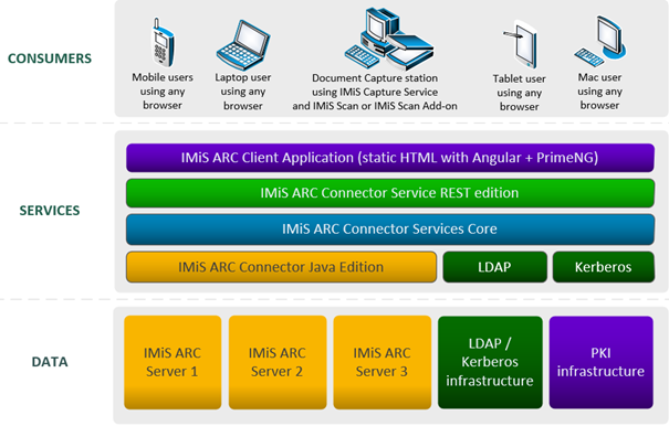 Spletni odjemalec IMiS ARC Client se preko spletne storitve IMiS ARC Connector Service REST povezuje z več arhivskimi strežniki IMiS ARC Server (glej shemo). To omogoča zajem vsebin in upravljanje gradiva v elektronski obliki za več ločenih organizacijskih enot iz ene same lokacije.